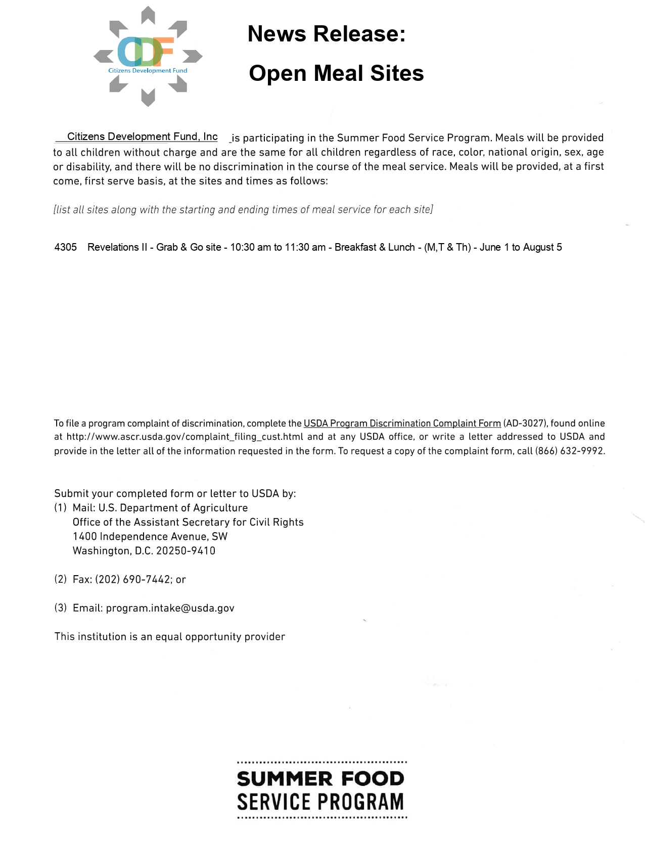 provides FREE, NUTRITOUS meals to KIDS and TEENS up to age 18 including breakfast, lunch, snack and dinner. Meals vary at each meal site. SFSP is funded by the United States Department of Agriculture and regulated by the Florida Department of Agriculture. CDF is an approved sponsor committed to ensuring no child goes hungry in the summer months. We successfully served over 150 youth in Holden Heights and Rosemont in the summer of 2021.